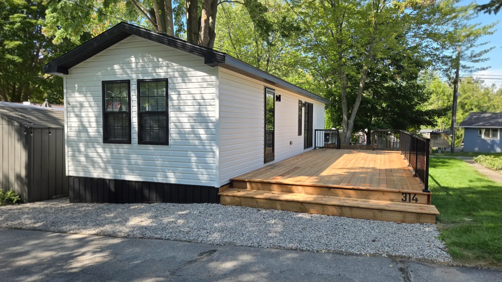 *New 2025 General Coach Martensville - Manor Series park model Length: 42' Bedrooms: 2 (primary queen, bunk room with 2 twin over 2 wide twin beds) plus pull out sectional storage sofa Details: Move in ready! Installed on site, with deck, vista railings, and skirting. Includes furniture and bedding. Unit is filled with built in storage! Upgrades include: stainless appliances, raised dormer with transom windows, electric fireplace and accent wall, backsplash, and upgraded hardware and lighting.