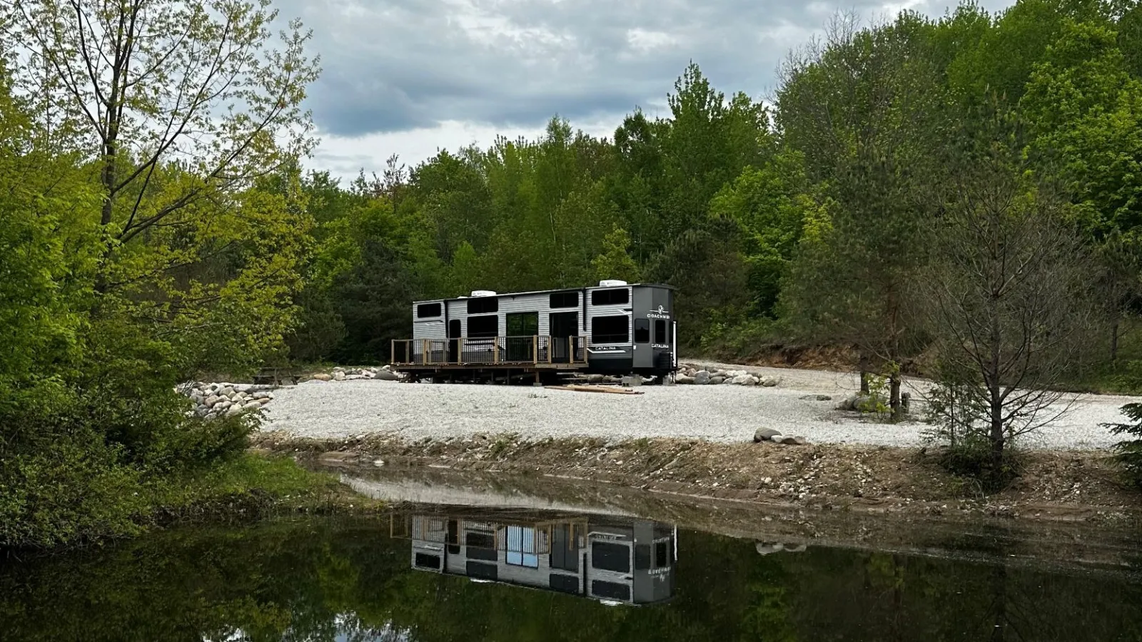 This trailer is located on a beautiful large lot at Dreamaker Family Campground with easy access to amenities. It is move in ready and packed with features to ensure a comfortable and enjoyable camping experience for your family. When you head inside, you will find the wide body design to be quite roomy even before both slides are fully extended. A private bedroom with outside entry makes it easy to slip out without disturbing those sleeping on the hide-a-bed in the living area!