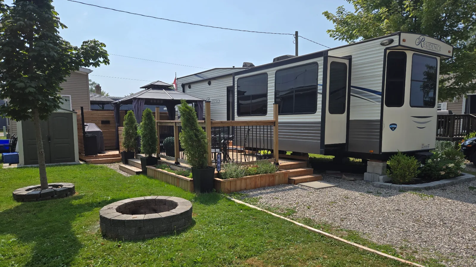2019 Keystone Residence Destination travel trailer Length: 40' Bedrooms: 1 plus loft (Primary king, loft with 2 twin beds), plus queen pull out sofa Details: Has hook ups for washer and dryer. Includes shed, deck, patio set - table, 4 chairs and umbrella, wood box with wood, lounge chair, 2 kayaks, gazebo with bug net curtains.